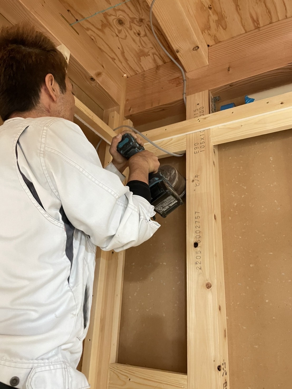 壁の材料(ボード)が貼られたら、室内のクロス(壁紙)を貼る前に、コンセントや照明機器を取り付けるための穴を開けていきます。